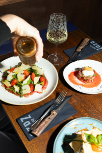 | Carpaccio de boeuf maison affiné au sel roquette, copeaux de parmesan et tomates cerises |